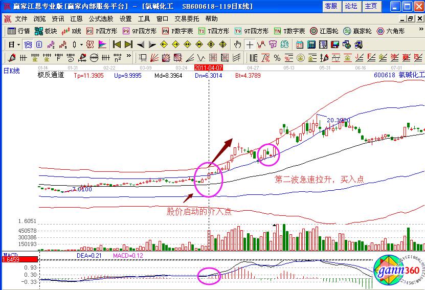 氯堿化工出現連續拉升的三陽線是一個比較特殊的案例,首先我們來分析前期的個股走勢,如圖在2011年4月2日的時候,股價拉升上漲突破了極反通道藍色上軌線,并且量能放大,macd指標形成了金叉買入的操作信號,是一個不錯的追漲介入點,在介入之后觀察后期走勢,股價連續拉升突破了紅色外軌線,在高檔區緩慢拉升三大陽線,但是上漲乏力出現了短暫的回調走勢,股價回踩藍色上軌線。