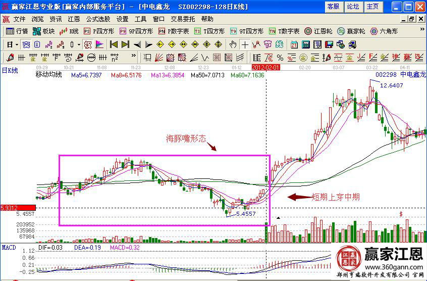 具體的案例走勢形態(tài)如圖中電鑫龍(002298)在2012年2月1日的個股走勢形態(tài),加上前期的個股走勢形態(tài),形成的是海豚嘴的形態(tài)走勢,形成的低位量能走勢,同時在2月1日的時候,短期均線向上穿過中期均線,并且出現(xiàn)了標(biāo)志性的K線走勢,是一個典型的牛股形態(tài)走勢,低位洗盤,量柱放量之后是啟動點位。