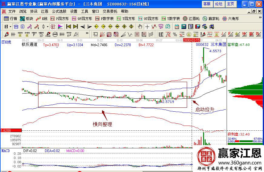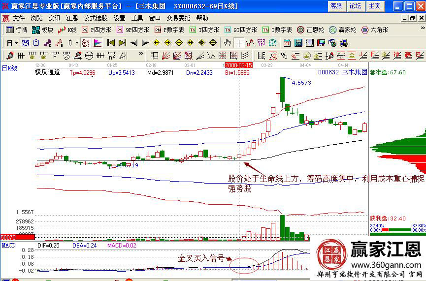 然而三木集團逐漸隨著大盤的回升而上升,從2000年3月15日向上突破整理平臺,開始向上拉升,對應的量能放大,macd指標形成金叉,關鍵是股價處于極反通道生命線上方,籌碼高度集中,是上漲的行情預測,投資者可以利用成本重心捕捉強勢股的走勢,當后期股價跌破支撐線下跌的時候,再及時的賣出獲利。