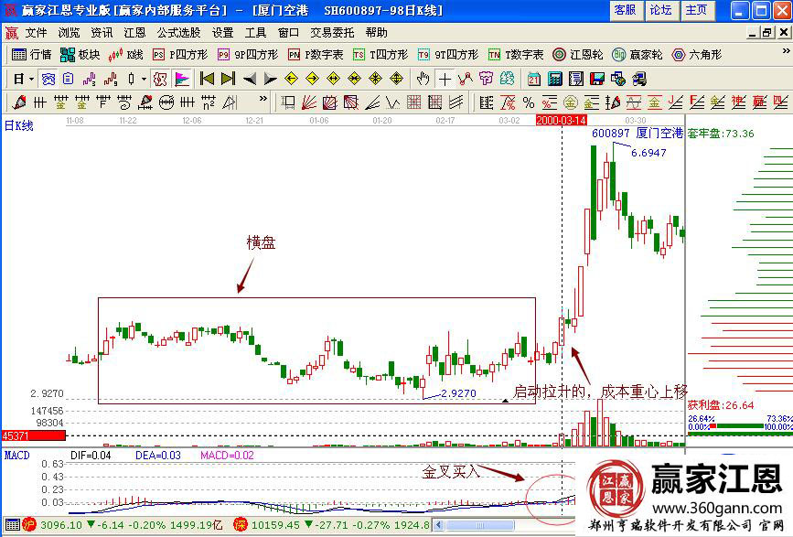 此后,股價經過長期的橫盤走勢,在2000年3月14日開始突破盤整走勢,向上拉升,成本重心逐漸上移,macd指標金叉信號,同時量能也是倍量放大,是強勢股的走勢,投資者可以積極的進行布局操作。