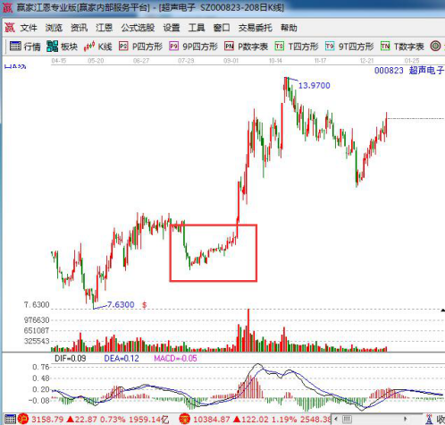 二、在k線形態(tài)上,k線的實體較小,通常有多根連續(xù)性的小陰小陽線,且其間常現(xiàn)十字星走勢;