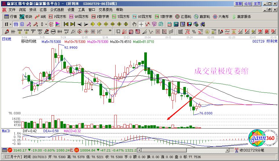 第一,成交量是技術分析中的核心標準,分析成交量是出發點,它有相對成交量和絕對成交量兩種概念,其中絕對成交量在一般情況下意義不大,只在新股上市第一天是重要參考指標,其后相對成交量是主要參考指標。而相對成交量又分為相對均衡、極度放量、極度縮量三種情況。在日k線圖中,成交量變化反映了莊家操作過程,若散戶精力有限,就可以透過極度放量來判斷莊家行為。若發現成交量突然放大,就可以判斷出莊家在此有所動作。