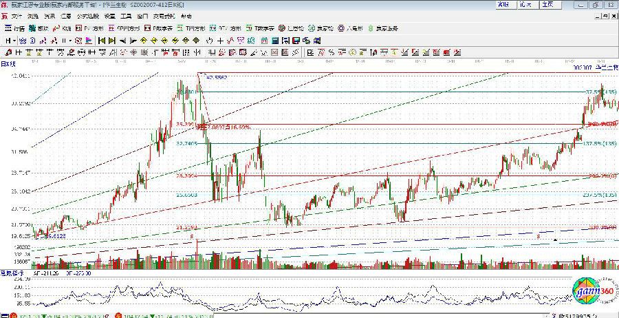 江恩角度線是以2014年4月29日的22.71為起點,波動率設為0.0387。(波動率有調整);波段百分比延伸線,是以2015年6月9日的35.31和6月11日的高點42.55為波段做出分析圖,同時設定保留重要的50%位置,所作出的圖形如下。