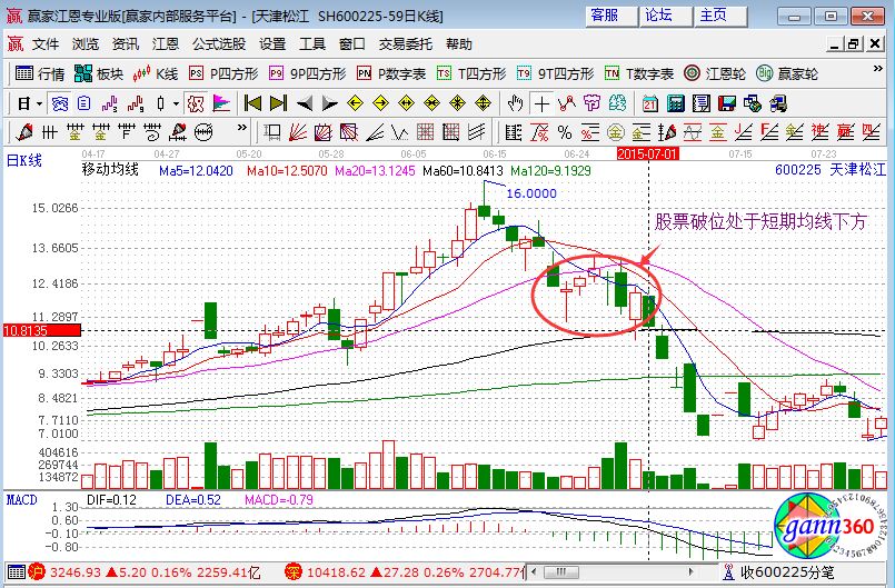 6、若股票出現(xiàn)破位走勢情況應(yīng)及時(shí)賣出,如下圖,股票的破位是走勢處于所有均線的下方,是股價(jià)在下跌過程中遇到反彈升高后又下跌至最低的情況,此時(shí)的走勢呈現(xiàn)死叉,一種弱勢運(yùn)行,為避免損失更多應(yīng)及時(shí)賣出。