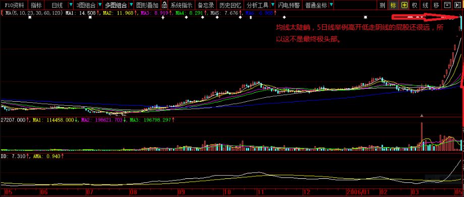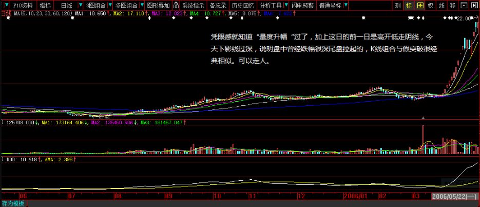 幾個交易日后,股價出現(xiàn)再次突破,那么是再來很多個漲停呢?還是假突破呢?股價已經(jīng)連續(xù)漲停10幾個交易日了,歷史上就沒有超過這么多漲停板的,再看下面圖中最后一天的前一天是高開低走的大陰線,而且最后一天的下影線很長,說明盤中跌幅很深,日線收陽是因為尾盤快速拉高所致。走人為上。