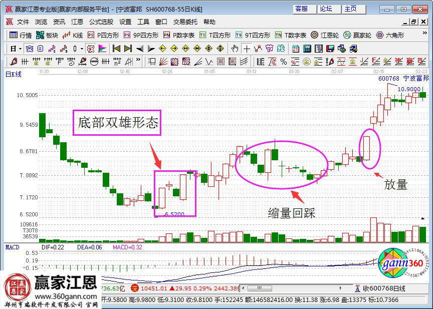 上圖是寧波富邦的走勢圖,圖中該股形成了非常明顯的底部雙雄形態。我們看到當這個形態出現之后就進行買入顯然不是好的買入時機。因為該股在該形態之后雖然有校服上漲,但是之后就走出了縮量回踩的走勢,在最后放量突破前期壓力位置的時候則是最佳的買入時機。