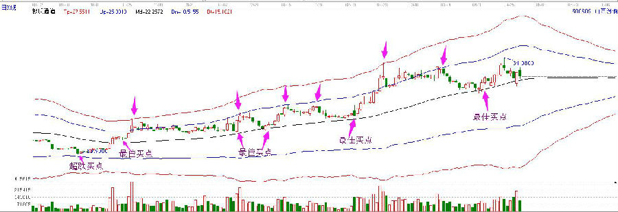 4.對選出來的量比大的個股,做好技術分析,均線系統也好,MACD分析也好或是其他的分析方法,當技術分析上,個股也符合操作的條件,那成功率當然更高。贏家江恩軟件的快速篩選個股工具為極反通道,即生命線(中間黑色曲線)附近為最佳買點。如下面山西汾酒的走勢圖,歷史上很多次的拉升,都可以看做是從生命線開始的,到達壓力位不突破,形成賣點.