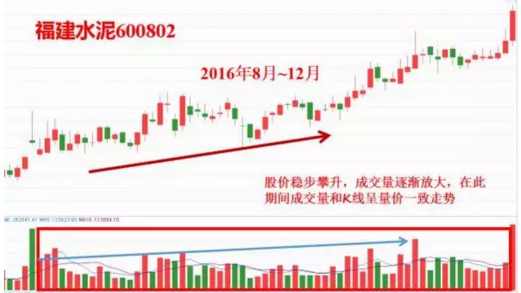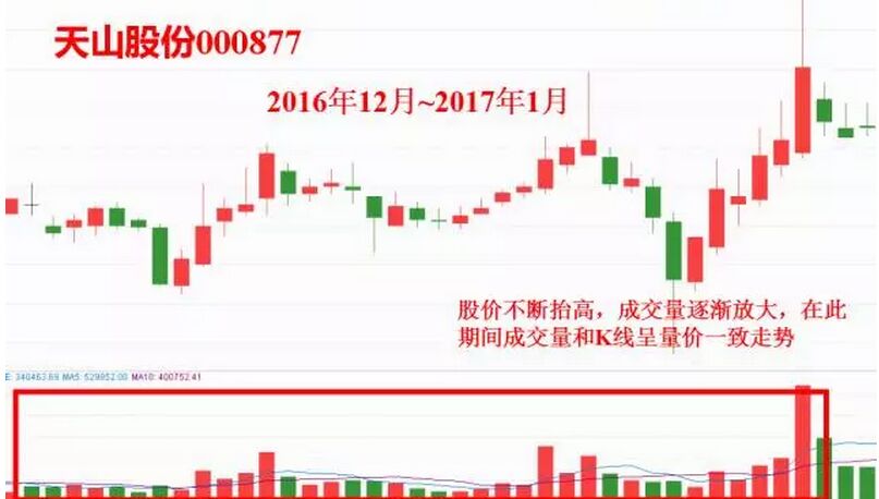 圖上是天山股份在2016年12月到今年1月的日K線走勢,在期間股價不斷太高,成交量逐漸放大,K線和成交量呈現出量價一致的走勢,即股價上漲成交量放大,股價下跌成交量縮小。
