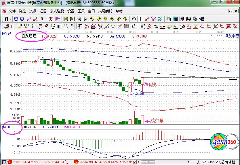 當我們調到K線的時候,一般會在K線的下方對應成交量的量柱,在成交量的下方像macd、kdj指標等的出現,當然這是要根據投資者自己的使用愛好進行調整的,在K線的上,大家也可以調出boll指標、極反通道、均線等指標的應用。下面就是贏家江恩軟件中海航創新的走勢圖。