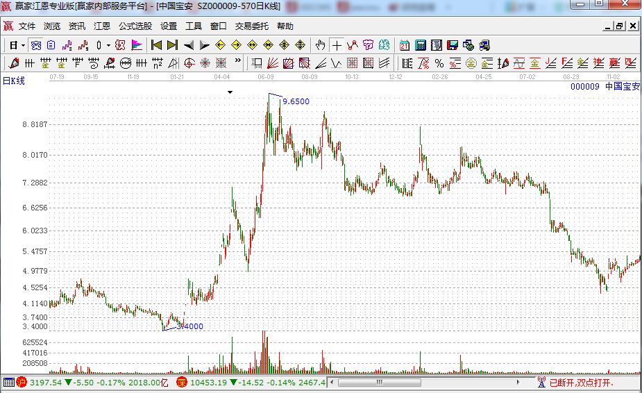 主力坐莊的完整過程通常是“吸、拉、派、落”,但受傷莊股的運動軌跡只有“吸、拉、落”,而少了一個“派”,就是說主力經過了吸籌和拉抬,沒來得及派發股價就回落了,這種情形令主力相當難過——這就是受傷莊股。接下來我們就來看一只受傷莊股。