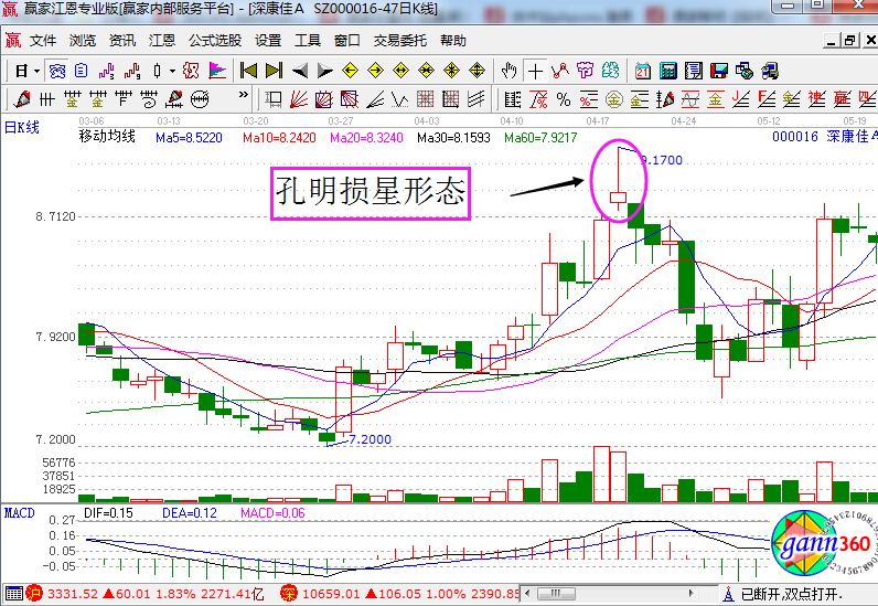 孔明損星形態(tài)是怎么樣的?如果從字面上理解的話,這個(gè)詞是用來形容輝煌過后的形式,如果是在股票中,那肯定也是上漲末期所出現(xiàn)的形態(tài)。從K線上看的話,它其實(shí)就是一根跳空向上的弓形線,而且基本上在該形態(tài)之后的第二天就收出實(shí)體比較長的陰線,如下面的深康佳A的走勢圖。