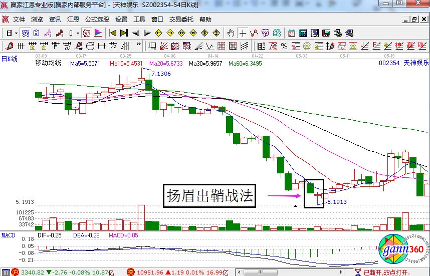 天神娛樂的走勢中就走出了非常典型的揚眉出鞘戰法,股價前一日的中陰線形成了很長一段的深度下跌走勢,并且在出現陽線十字打樁線走勢,兩天就構成了完整的揚眉出鞘戰法,所以對于投資者就可以確定為反彈行情了,所以投資者可以在次日進行買入操作。