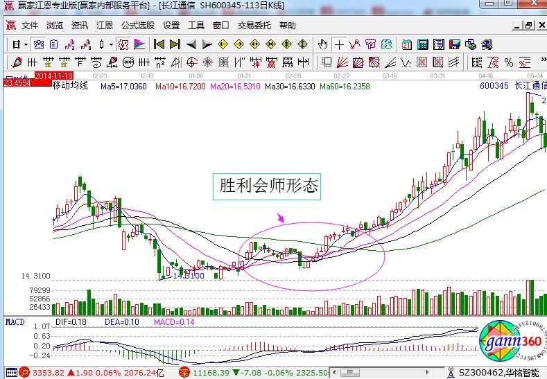股票勝利會(huì)師形態(tài)是怎么樣的?它其實(shí)指的就是短期、中期和長(zhǎng)期均線由空頭排列到逐漸的聚攏、糾纏在一起,最后完成了多頭排列的過程,如下面的長(zhǎng)江通信走勢(shì)圖。