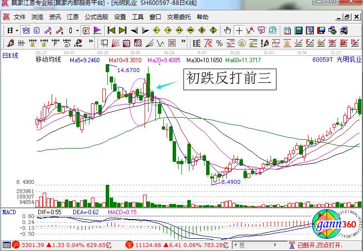 上面是光明乳業(yè)的在2007年10月份的走勢,股價在上漲的高位出現(xiàn)了一個具有長下影線的長陽線,其中它包絡了前面三個交易日的K線走勢,形成了典型的初跌反打前三的走勢形態(tài)。同時我們看均線上的走勢,它已經走出了拐頭向下的趨勢,成交量的量能逐漸的縮小,同時macd指標形成了死叉的賣出信號,顯然投資者應該及時把握賣出的機會。我們調出極反通道來進一步的分析股價所處的位置。