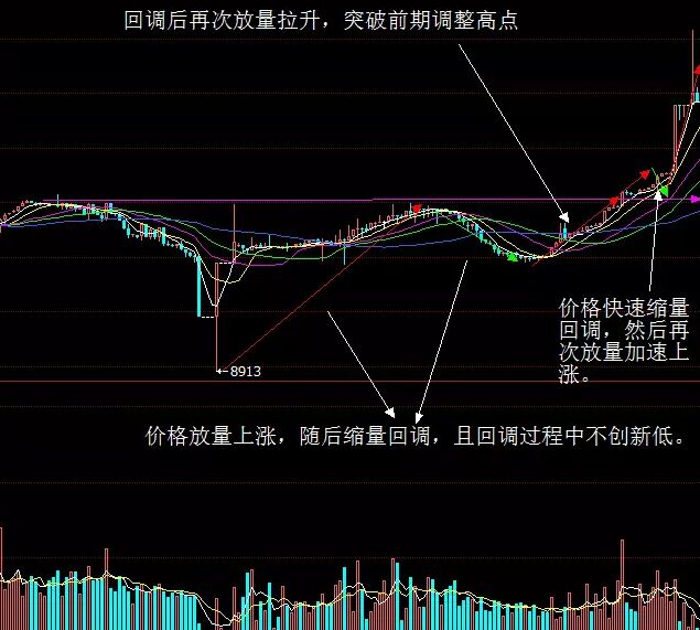 1、 價格放量上漲,然后回調時不能創新低,再次上行的時候量能重新放大。