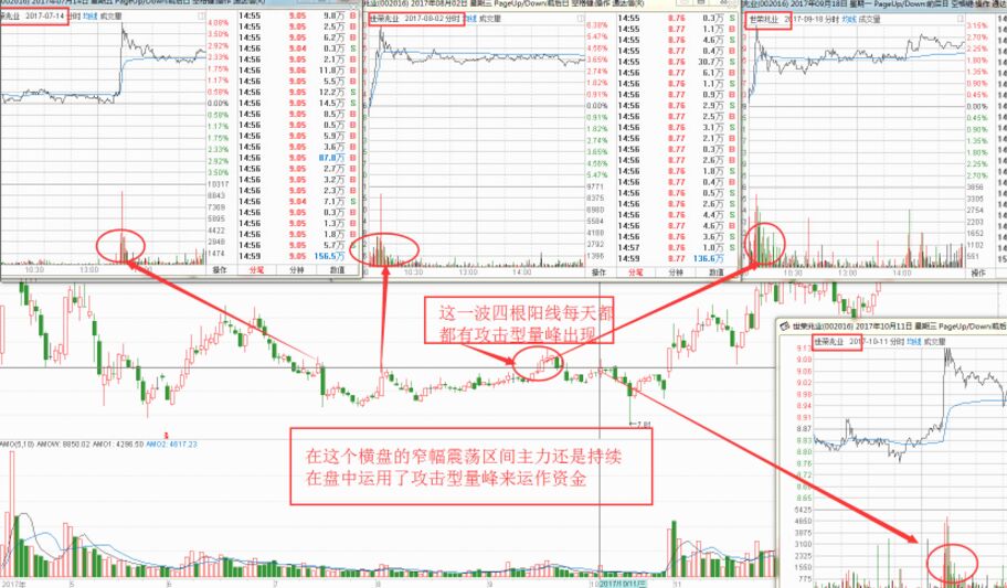 攻擊型量峰是怎么樣的?它指的就是在交易過程中,主力機構在盤中不間斷地持續投入大筆資金積極買進所造成的股價在特定時間段發生劇烈波動的現象。由于攻擊型量峰在盤中不間斷的持續性大筆資金的投入,這就決定了不可能是小資金的行為,所以投資者對于這樣的股票挖掘是具有實戰意義的。如下圖所示。
