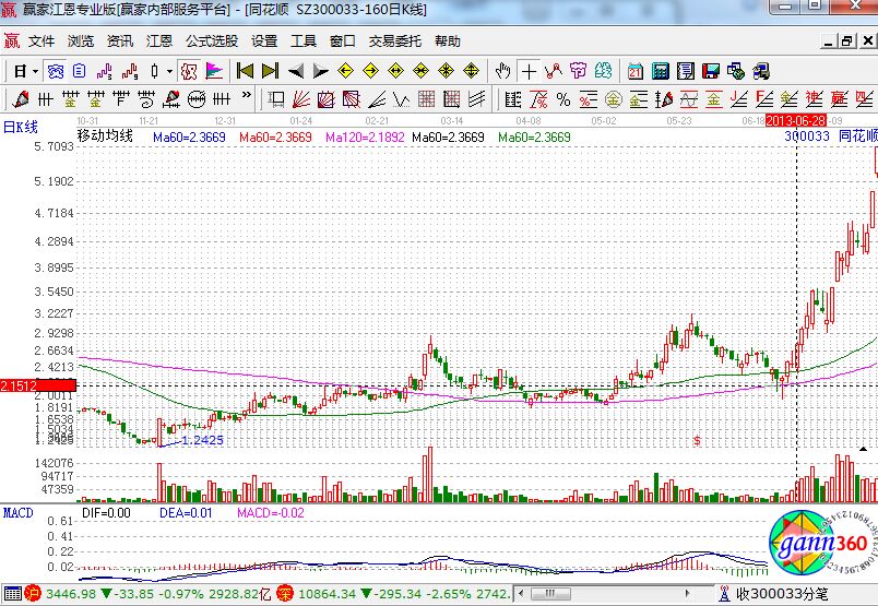 上圖是同花順在2013年部分走勢圖,從上圖我們可以看到該股在5月份的時候突破60日均線走出了一波很有力度的上漲行情,6月份隨大盤該股出現補跌,月底啟穩在60日均線附近,經過1周時間的整理,6月28日該股出現向上突破趨勢,此時出現很好的短線買點,隨后一路放量上漲,連續暴拉,截止到最后一根陽線的話有80%以上的漲幅,牛股風采盡顯。