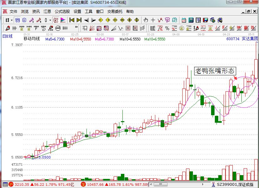 對于老鴨頭形態相信大家已經了解了,其中還有一個形態就是老鴨張嘴形態,它的技術特征是:5日線和10日線形成金叉反散之后,5日線在靠近10日均線但是還沒有到10日均線的時候就會重新拐頭向上方運行,形成的圖形就是老鴨張嘴形態。接下來我們就來看實達集團的案例圖形。