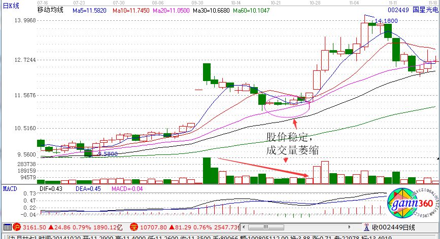 在空頭市場中,投資者都是看壞后市的,但是如果出現了股票價格穩定,同時成交量也在萎縮,顯然是一種買入的信號,如下面的國星光電走勢圖。