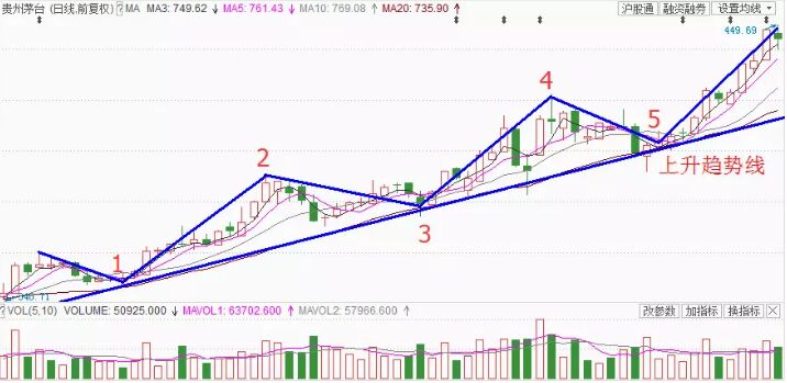 上面是貴州茅臺(tái)的走勢(shì)圖,從圖中可以看到:連接該股票的每一波的波谷可以劃一條上升趨勢(shì)線,該股票一直延續(xù)該條線保持上升趨勢(shì)。我們標(biāo)注每一波的波峰和波谷會(huì)發(fā)現(xiàn)4>2、5>3>1,也即形態(tài)為過(guò)高不破低形態(tài),所以,當(dāng)下次我們碰到這種過(guò)高不破低形態(tài)的股票時(shí)即可找時(shí)機(jī)選擇買入布局。