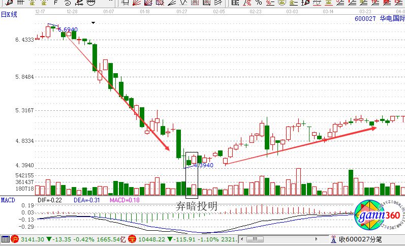 棄暗投明形態的名稱是怎么來的呢?它其實指的就是:K線下跌后的相對低位,或者盤整區域,或者上升趨勢的波段回調中,意味著多頭勢力的起步,空頭勢力的衰竭,K線將會上漲,所以投資者應當放棄之前下跌的判斷,轉為上漲,所以稱棄暗投明。接下來我們就以華電國際的為例來為大家講解該形態的要點。
