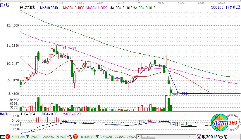 通過均線我們可以判斷處股票的阻力強度,當個股沖上某一條均線之后又快速回落該均線之下,顯然就說明了這條均線的阻力是非常強的,如下面的科泰電源走勢圖。