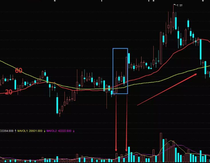 陰線的出現其實是主力為了騙散戶讓籌碼拋出,所以散戶賣了,主力沒有大幅賣出,因此成交量沒有放大,而是萎縮,而第三根陽線的出現,基本可以判定主力是要拉升股價,所以投資者可以選擇在第三根陽線附近選擇建倉。