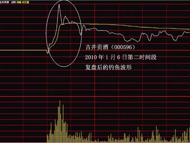 股票釣魚波是怎么樣的?它其實指的就是股價在盤中拉升過程中弧線幾乎垂直式跳水下跌的波動特征,因這一波動特征而形成的即時波形就是“釣魚波”。由于該形態出現前,股價呈現長波攻擊性拉高特征,當股價漲至一定高位時,盤中突然跳水,其形態就像釣魚姿態,故此得名。如下面的古井貢酒的分時走勢圖。