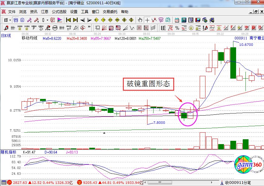 破鏡重圓的陽量一定要大于它的陰量,陽線一定要覆蓋前面的陰線,這是判斷破鏡能否重圓的關鍵。破鏡重圓若出現在55日線未走平的時刻,說明場內依然有不少獲利盤,整理仍將繼續,只有破鏡重圓出現在翹起的55日線之上,大家的持股成本基本一致,因而股價才能選擇向上,莊家建倉時,為了減輕未來的拉升阻力,一般會進行一次徹底的洗盤動作,但往往會跌破55日線,而且股價很快就會被拉上去,一旦股價重新站穩55日線,通常是較好的進場時機。