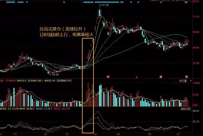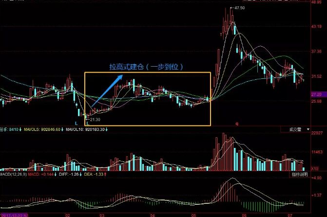拉高式建倉大多是出現在冷門股以及長期下跌的股票中,具體的表現就是:股價迅速從低位抬高,成交量急速放大。這種以空間換取時間的建倉方式表明莊家實力雄厚、作風兇悍,后期必有巨大的上升空間。拉高式建倉一般有兩種情況,即一步到位式和連續拉升式。