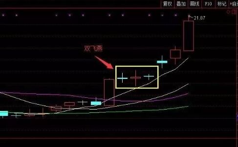 “雙飛燕”形態(tài)是一種K線技術(shù)形狀,走勢上出現(xiàn)大陽之后兩根并排上揚成交量和振幅逐步遞減的十字星,而且均線系統(tǒng)通常是以完美的多頭排列列示,股價沿著10日均線強勁攀升。當“雙飛燕”形態(tài)形態(tài)出現(xiàn)之后,股價一般大概率上是上行的,從這個意義上來說,該形態(tài)還有這推測頂部的功能,要注意該形態(tài)的位置,位置低,期望值就可大些,如果位置高,期望值就要小些,而且隨時準備清倉離場。如下圖所示。