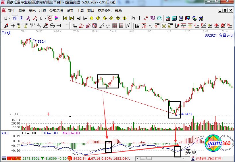 從這一張走勢圖形,我們可以看到,股價震蕩下行,不斷的出現價格新低,整體的價格是在下降的,而對應的macd的雙線趨勢上升的,特別是股價低點時,macd柱在零軸線上方,DIF線向上勾頭,這就構成了底背離。