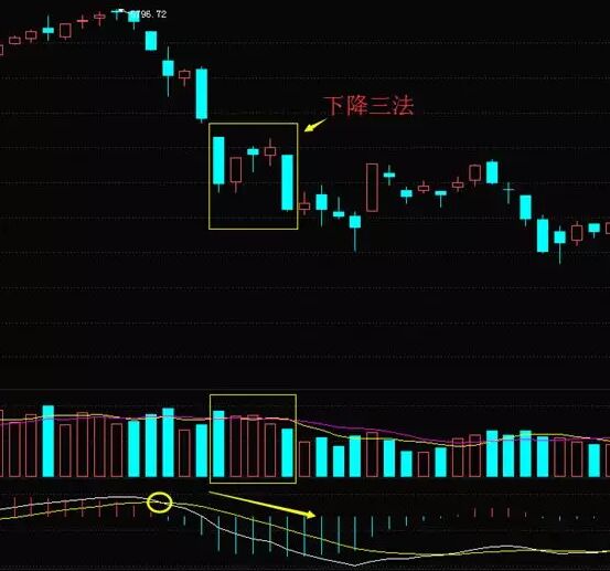 如上圖所示,當形態走出后,可以發現,這5根K線形態類似矩形盤整,最后大陰線的創新低實際是跌破矩形盤整,因此K線后續仍是下降趨勢。當該形態形成后,投資者最好觀察一下副圖指標macd,如果macd剛形成死叉不就,或沒有明顯止跌回升跡象,則更可確認后市將繼續下跌。