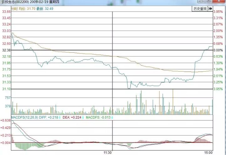 上面是云投生態的日K線走勢圖,從這張走勢圖中我們可以看到:股價上漲過程中突然面臨下跌的威脅,突如其來的連續兩天放量下跌打破了上升的趨勢。就在投資者絕望之時間,第三日股價高開高走,盤中跌幅一度是達到了4%,但是在收盤的前半小時內股價居然起死回生般上漲了,單日股價收于32.49元/股,小腹上漲0.34%。下面就是該股在當時的分時走勢圖。