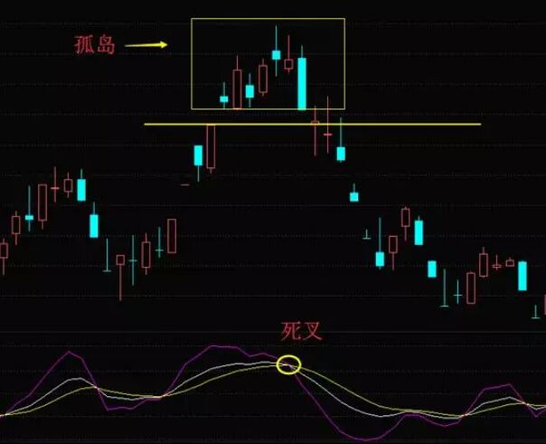 除此之外,我們參考一下幅圖指標(biāo)KDJ,島型形態(tài)形態(tài)之后,該指標(biāo)顯示股價(jià)處于超買狀態(tài),拐頭向下,形成死叉,則更可確認(rèn)后市下跌的走勢。