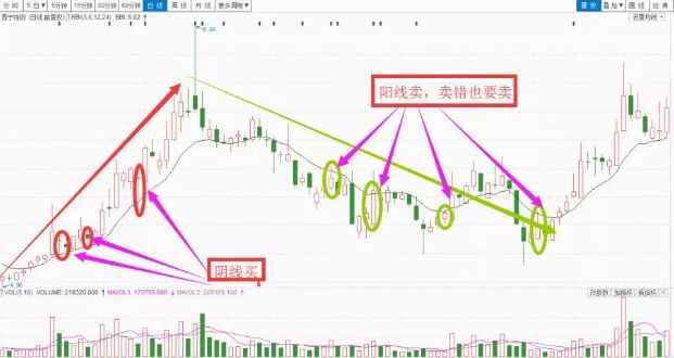 陰陽線戰法的具體步驟為:第①步,選擇上升趨勢良好的個股;第②步,線上陰線買;第③步:線下陽線賣。