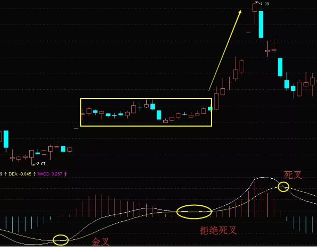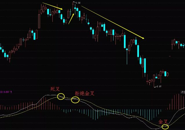 如上圖所示,股價經(jīng)過了一段時間的上漲,已經(jīng)是處于相對的高位了,股價已經(jīng)是無力上漲了,所以開始下跌,macd白線下穿黃線形成死叉,此后股價很快進行反彈再次沖擊前高,macd欲形成金叉,但白線剛觸及黃線,股價即無力下跌,金叉尚未形成,白線再度下跌,由此形成“拒絕金叉”,此后股價與MACD雙線均一路向下,走出下降趨勢。