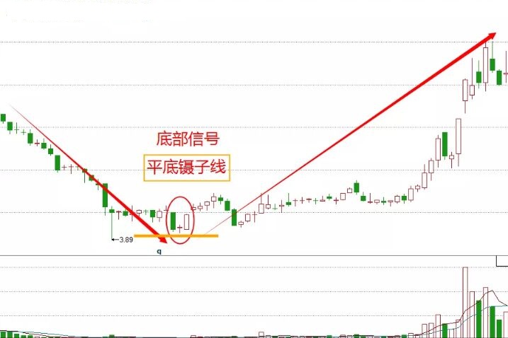 2、平底鑷子線。它是由兩根最低價(jià)位相同的K線形成,當(dāng)平底鑷子線出現(xiàn)在走勢底部時(shí),行業(yè)將會(huì)轉(zhuǎn)為牛市。該形態(tài)一般第一天為長陰,第二天多頭集聚,使得一度行情上揚(yáng),但終究不敵空頭的勢力,行情仍舊下滑但并沒有能突破第一天最低點(diǎn)。第三天市場出現(xiàn)轉(zhuǎn)機(jī)收出長陽,市場由做空漸漸轉(zhuǎn)為作多,其他技術(shù)指標(biāo)也顯示了買進(jìn)訊號。如下面的卓郎智能走勢圖。