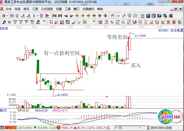 如上圖所示,這是白云電器近期的走勢圖,從圖中我們可以看到,在2018年11月23日的時候,出現了一次大跌,之后連續三天都出現了小陰陽線進行整理,形成了一個碗底,之后在11月29日出現一個大陽線使得碗口形態真正形成,如果能在剛出現陽線突破碗底整理平臺時買入,兩天能收獲不少漲幅,之后也可能有一定的獲利空間。