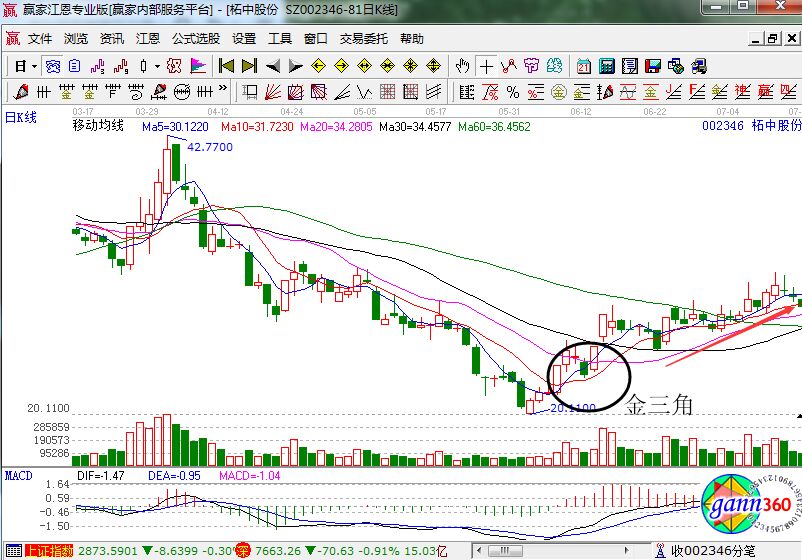 我們來看柘中股份的日K線走勢圖,從圖中我們可以看到該股的低位形成了一個金三角金叉,但是盈利空間來看,本段行情形成后的漲幅有30%多,不算太多,但是和當時其他股票來比較,利潤還是比較的客觀。如上圖所示,在一輪震蕩下跌后,行情開始低位出現幾根陽線,然后5日均線迅速的穿過10日和20日線,這個時候10日線也震蕩攀升穿過20日線。終于,行情在較低位置形成一個金三角。暗示后市行情將會有較大漲幅,此階段進場最佳。