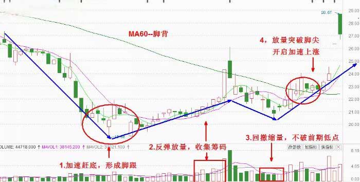 研究莊股,就會(huì)發(fā)現(xiàn)一個(gè)規(guī)律,即:莊家往往在下跌后期有一個(gè)加速趕底的動(dòng)作,快速跌到底部后就形成了腳跟,因?yàn)榭焖傧碌笥蟹磸棧磸椀街虚L(zhǎng)期均線處必然是會(huì)遇阻回落的,之后股價(jià)在中長(zhǎng)期均線的壓制下逐步的走低,此時(shí)的中長(zhǎng)均線就像腳背,股價(jià)的回落能夠不創(chuàng)新低。