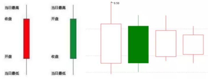 打開股票軟件,調(diào)出K線圖,每一根K線都含有開盤價、最高價、最低價和收盤價。而開盤價和收盤價之間稱為實體。相應的圖形如下。