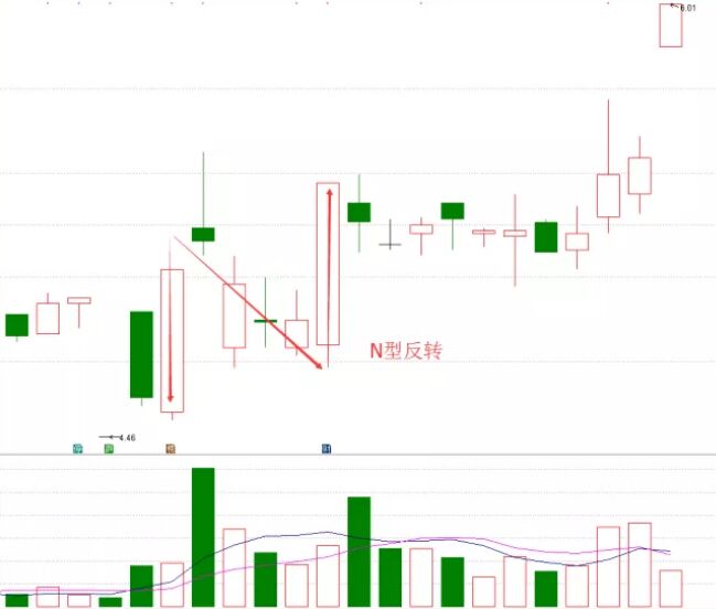 5、N型反轉(zhuǎn)。此形態(tài)出現(xiàn)在上漲的途中,是由大小不等的多根K線所組成,即大陽線加上若干小陰線在加上大陽線所組成。回調(diào)陽線組沒有跌破第一根陽線開盤價,具有看漲意義,如下面的圖形所示。