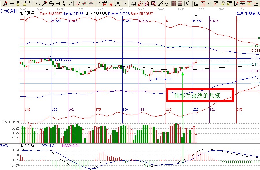 在黃金上穿極反通道生命的時候,指標(biāo)macd 柱子是紅色的,但是黃白線沒有上0軸不夠強勢。當(dāng)指標(biāo)macd黃白線上0軸 的時候,柱子也是紅色的時候,這個時候黃金在上面突破極反通道生命線然后回踩生命線。指標(biāo)macd跟贏家極反通道形成了共振的買點。