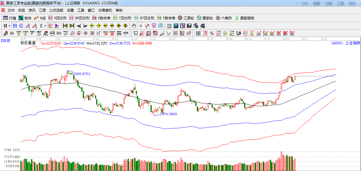 極反通道提示:指數(shù)高開一路震蕩上行,關(guān)注外軌線2242點(diǎn)阻力。