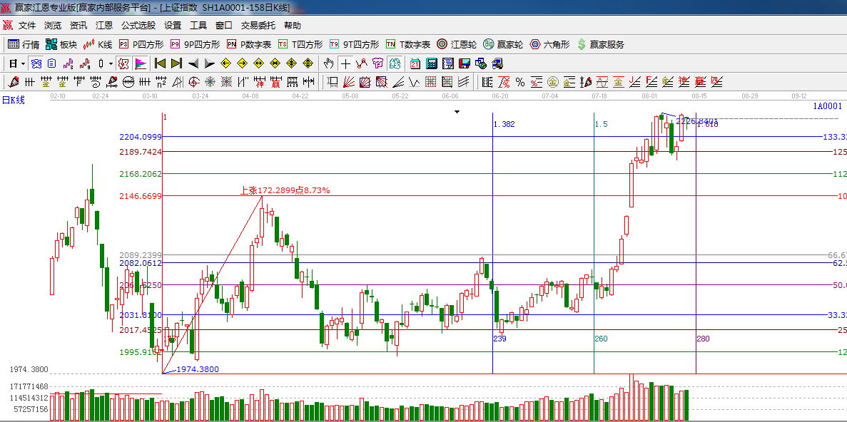 ★依據贏家江恩系統波段百分比提示:指數再次強勢上漲,上方阻力180度2232點,225度,2254點