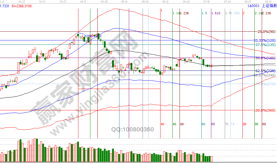 15號是月初通過贏家江恩系統時間周期工具測算出的7月第二個時間窗口,大盤結束為其3天的黑色生命線下運行收復并站在線上,這是一個積極信號,不完美之處有兩點,一是收復時成交量未放大,二是短周期不協調。綜合判斷,今日早盤收復短線參考關鍵線,依據工具規則激進者可分開始分批博弈參與,同時提供了應對策略為向下失守60分鐘藍色下軌線被動出局,向上觀察江恩價格四方形等空間工具測算得出的2844、2966點,突破收復2966后才能向上拓展空間。7月15號盤中壓力是225度2944點、270度2961點,盤中支撐是135度2911點、90度2894點。操作策略,指數圍繞極反通道生命線上下震蕩,2822反彈動作還未明確結束信號,時間窗口關注方向選擇,整體持倉保持3成左右。