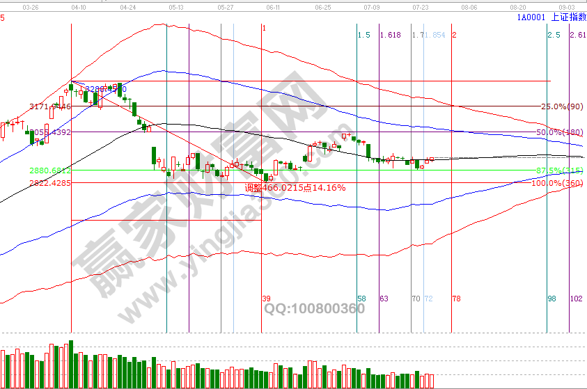 24號先行指數上證50收復短周期60分鐘關鍵位,贏家江恩技術服務老師在學員區及時解讀了此信號,收復此線則代表新一波震蕩反彈動作的展開,周四滬指日線及短周期全部進入生命線上安全區域,需要注意的是短周期15分鐘即將觸碰極反通道藍色上軌線,預示著26號早盤沖高后會出現滯漲情況,從各周期線關系看反彈動作還將延續,修整是對突破日線生命線一次確認動作,此處反彈空間與時間維持不變,下個時間窗口是8月1號,7月26號盤中壓力是225度2944點、270度2961點,盤中支撐是135度2911點。操作策略,指數極反通道生命線震蕩,信號延續價格看60分鐘上軌線,時間看8月1號,信號結束為上證50失守60分鐘生命線,整體持倉保持3成。