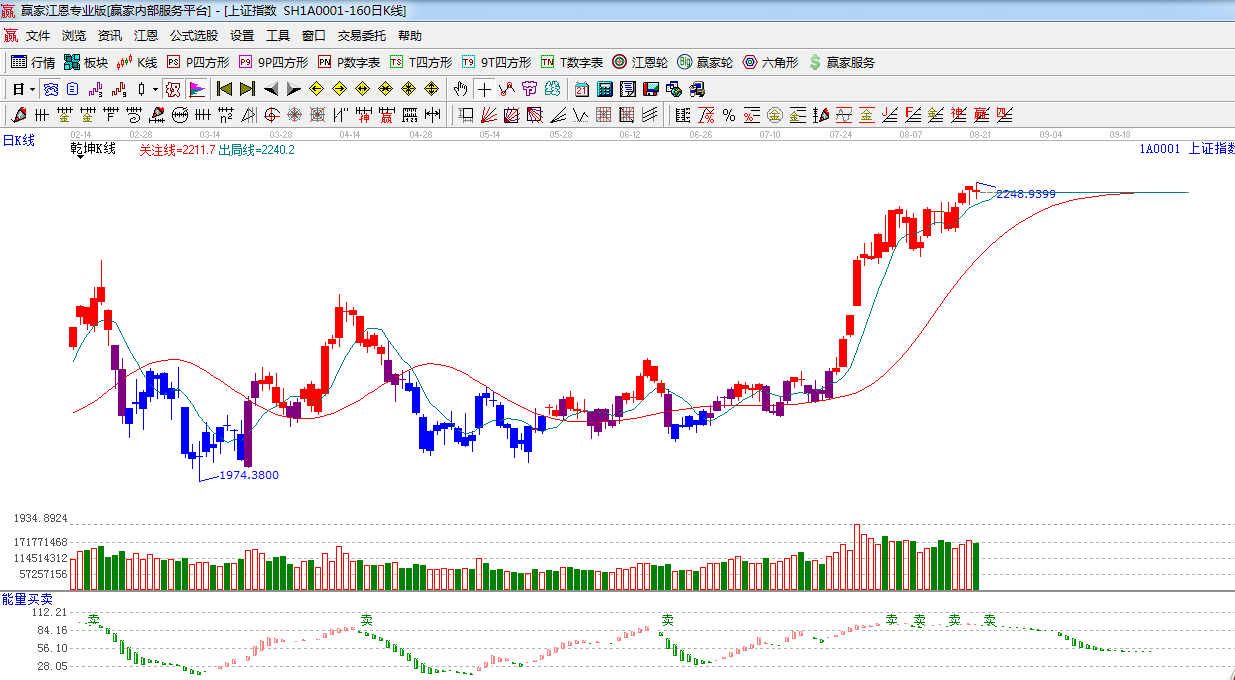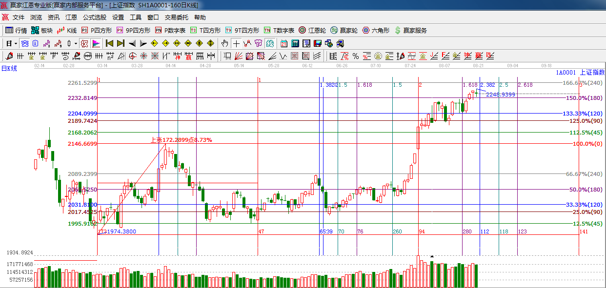 ★依據(jù)贏家江恩系統(tǒng)波段百分比提示:盤中回踩180度支撐線2232點(diǎn),上方阻力 225度是2254點(diǎn),240度2261點(diǎn)。