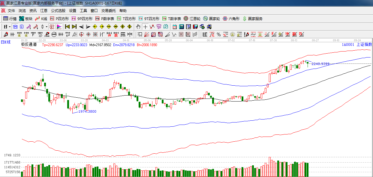 ★依據贏家江恩系統極反通道提示:周四如期回探,終盤吊頸線收盤,下方藍色外軌線支撐是2200點。